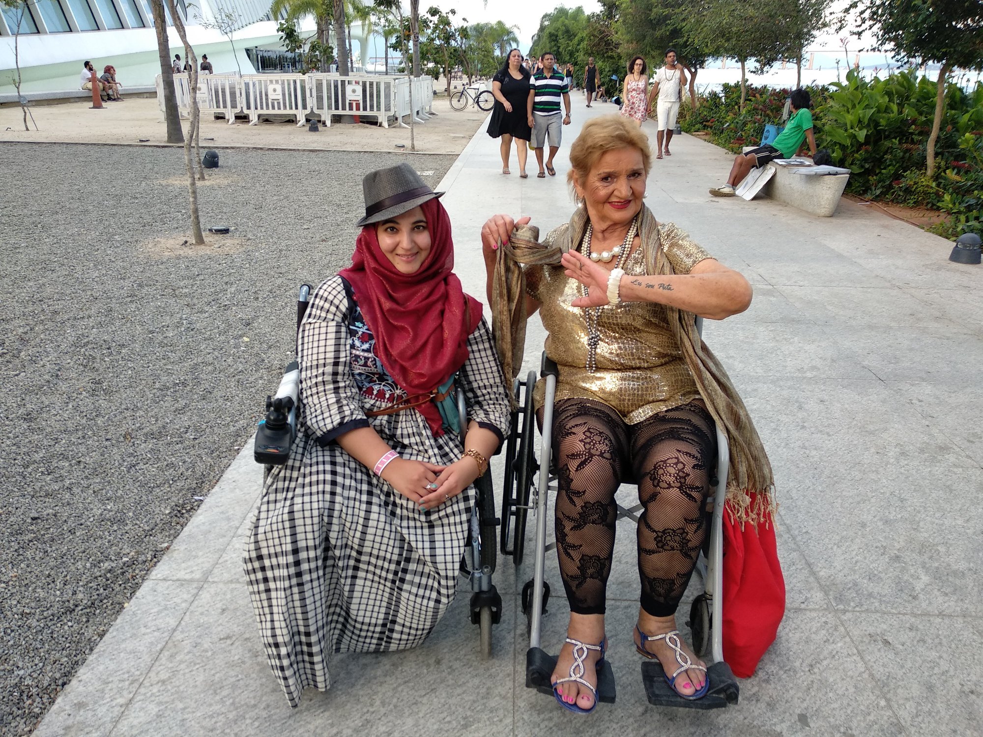 At the craft stalls, I meet a lively woman using a wheelchair. I instantly love everything about her, her clothes, her smile, her lip colour. Maria tells me she is a retired sex worker and part of the festival. I ask for a photo. She extends her arm, revealing a tattoo that reads: Eu sou puta.